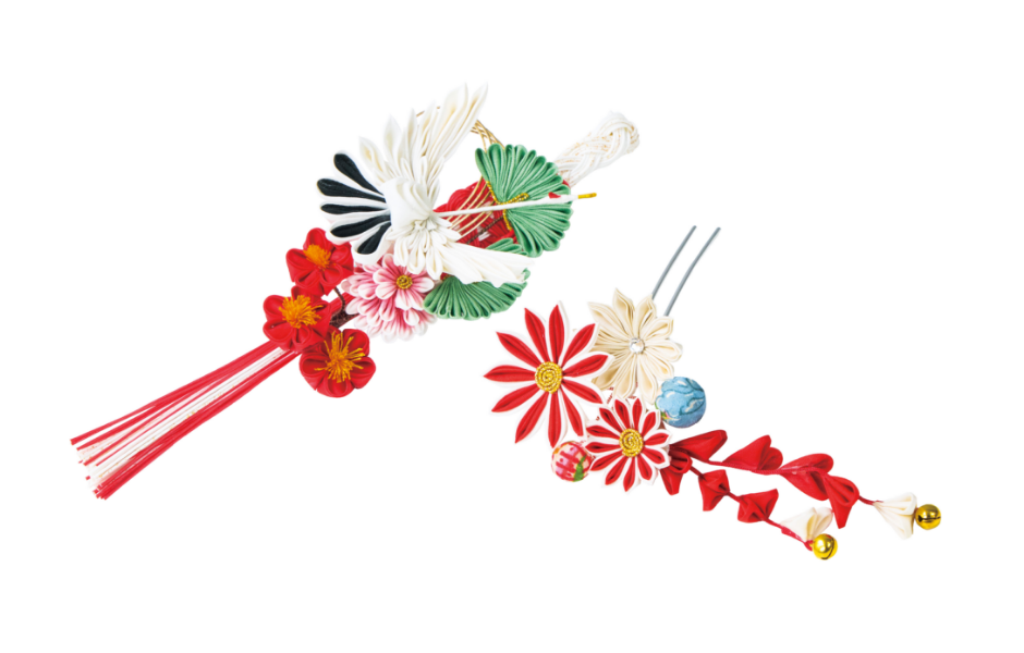 裁断した正方形の布地を様々な形に折りたたみ、澱粉糊(でんぷんのり)を用いて組み合わせる、花などをかたどった作品。職人のつまみ方や布地によって多彩な表現が可能で、江戸土産として人気を博した。