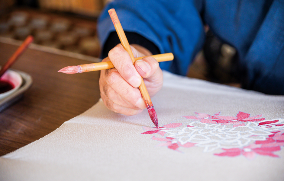 金箔や銀箔を使いバラや菊などを描いた、華やかで洗練された作品を手がけていた父。その職人としての姿に憧れを抱き、高校卒業後すぐに弟子入りをしました。作品によって制作工程は異なりますが、まずは白生地を裁断して図案を描き、ムラサキツユクサの花弁から抽出した「あいばな」で下絵を施します。そして、下絵の線に沿って糸のように細く糊を置く作業を経て色を挿していきます。細かいものも含めると少なくとも23の工程があり、振袖の制作時はさらに刺繍を施すなど、様々な技術が求められます。