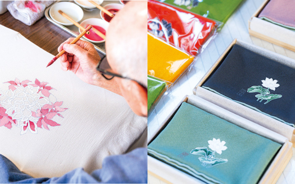 古典やモダンといわれるように、流行は変化するもの。着物も伝統工芸だからと言って地色や柄を固定化するのではなく、常に時代とともに変えていくべきだと感じます。最近では、若い人にも使ってもらえるような色味・生地にこだわった、小風呂敷を制作しました。作品を間近に見て、幅広い世代に楽しんでもらいたいです。
