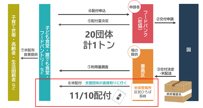 豊島区は、本日11月10日(月曜)に「子ども食堂」や「高齢者のための誰でも食堂」、フードパントリーなどを行う区内20の支援団体に対して、区独自のフードバンク拠点化スキームを活用し、区民ひろば長崎にて計1トンの政府備蓄米の配付を開始しました。