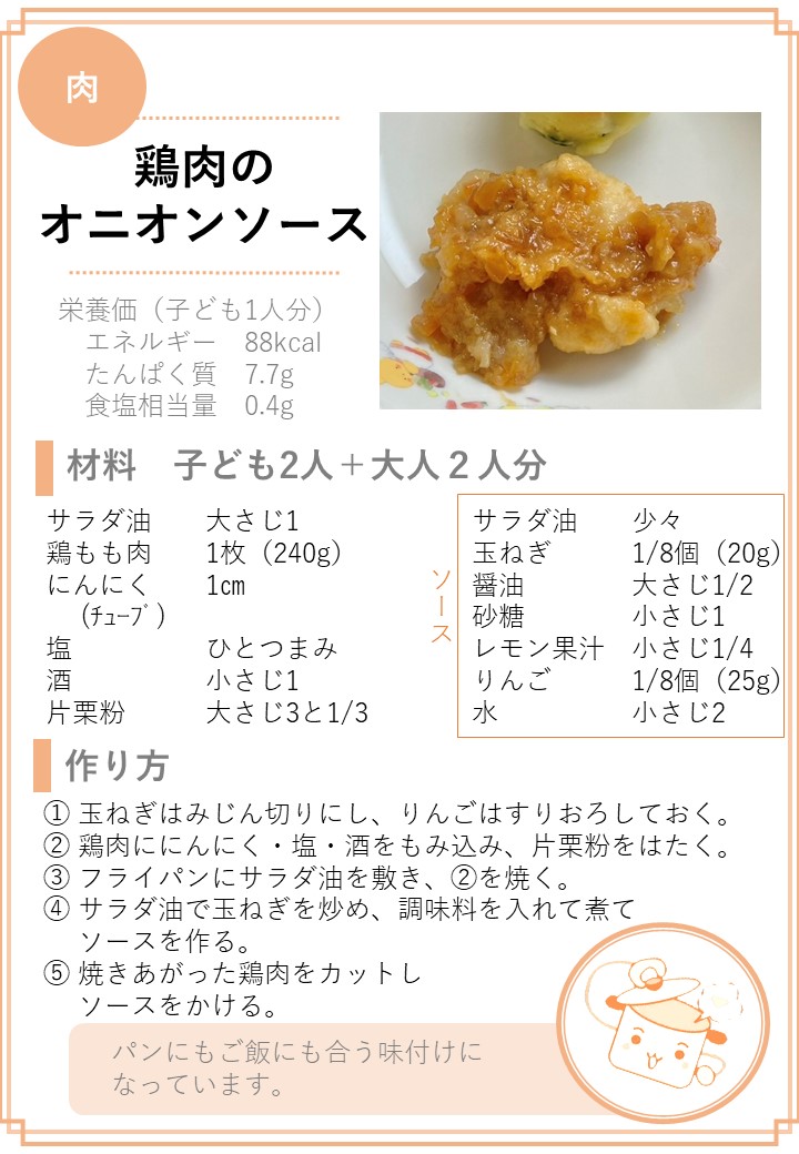 ホーム > 子育て・教育 > 保育 > 保育園の在園・退園に関すること > 保育園給食に関すること > 保育園給食レシピ集 > 肉料理