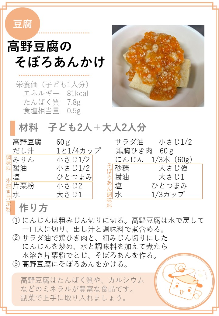 ホーム > 子育て・教育 > 保育 > 保育園の在園・退園に関すること > 保育園給食に関すること > 保育園給食レシピ集 > 豆腐料理